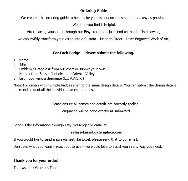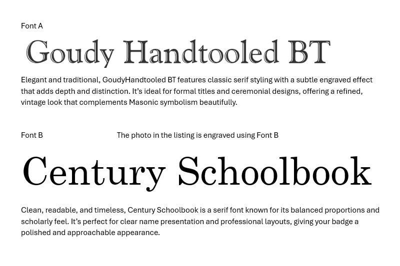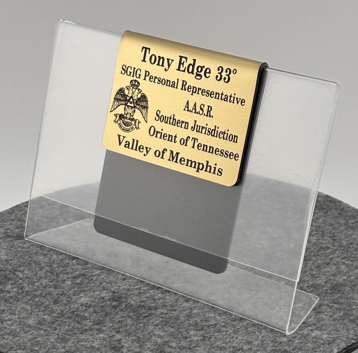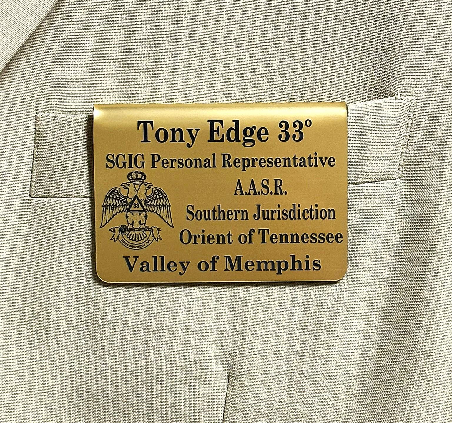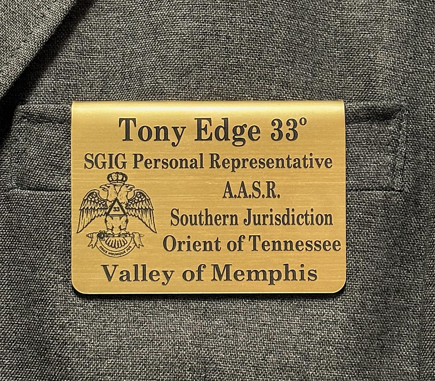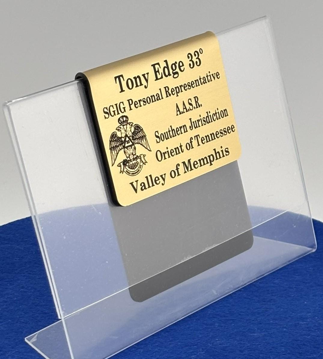 Show your Scottish Rite affiliation with pride and professionalism. This custom-engraved name badge is designed specifically for members of the Ancient and Accepted Scottish Rite, featuring the iconic double-headed eagle emblem and your personalized details.