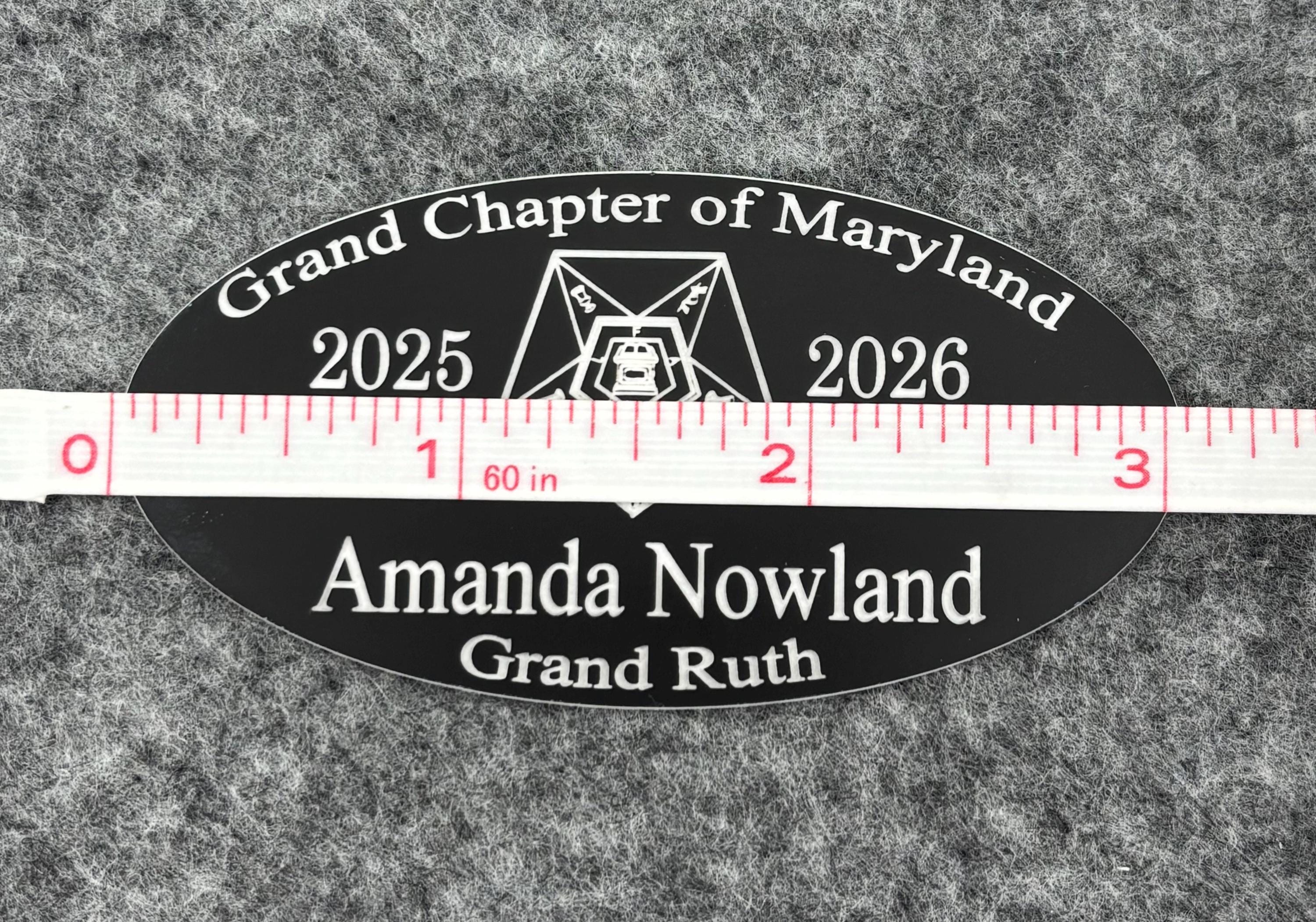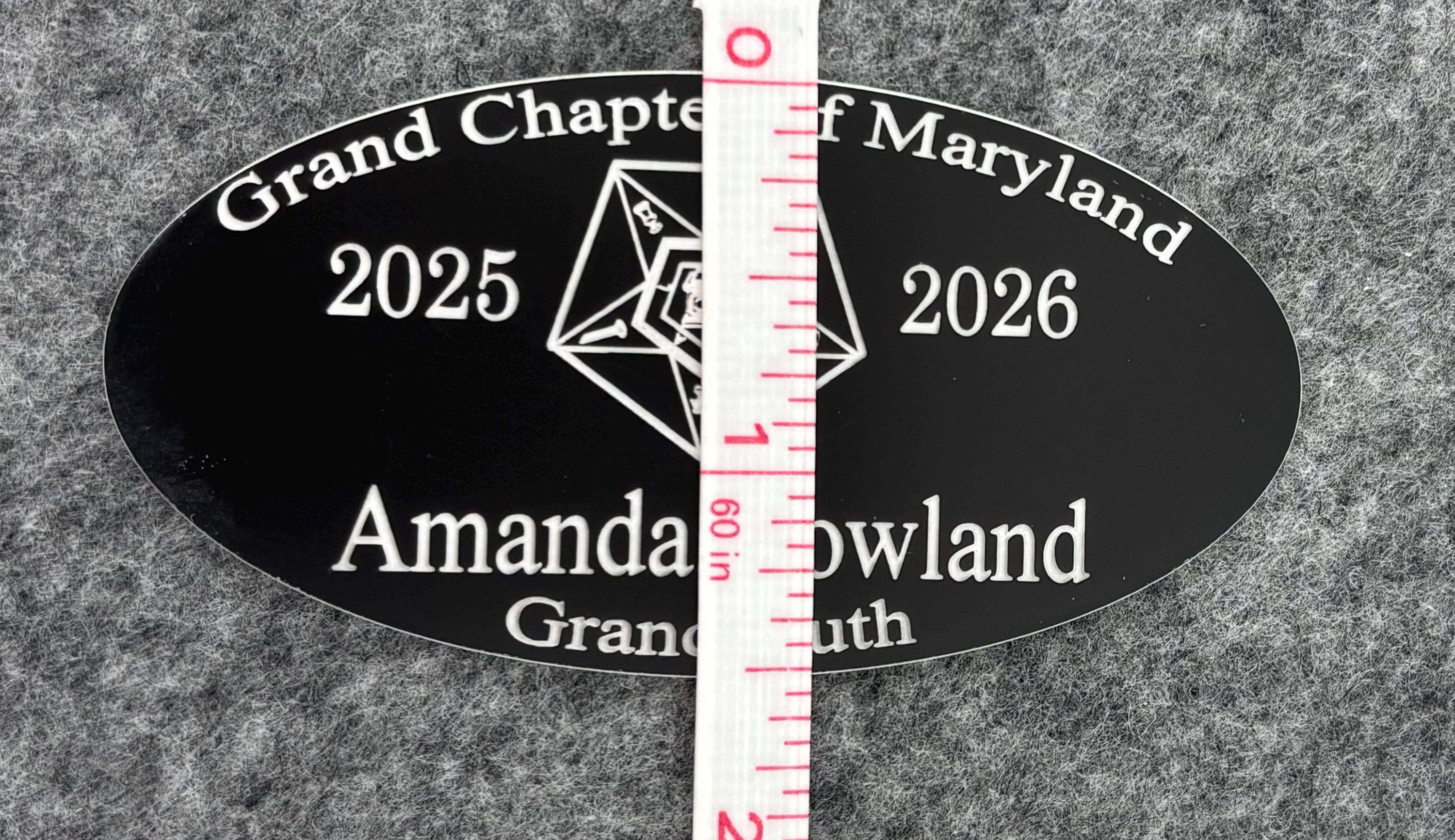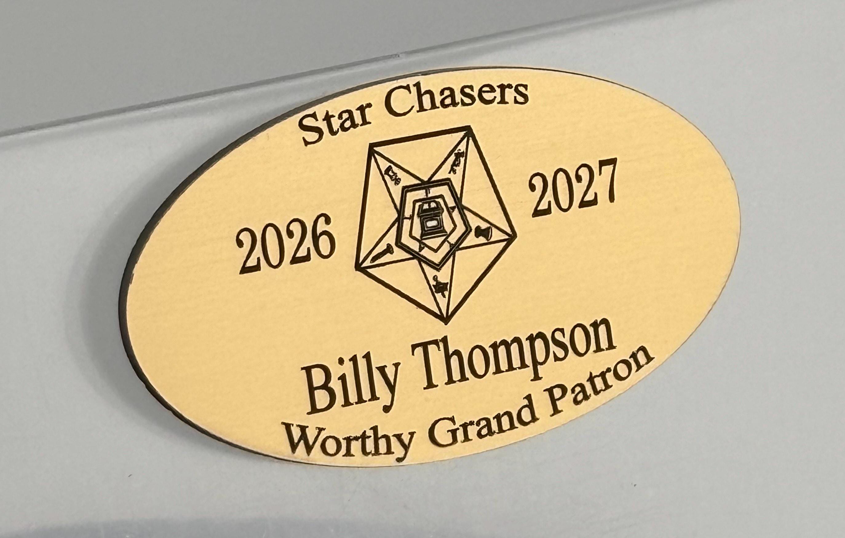 Beautifully engraved Order of the Eastern Star (OES) Name Badge, crafted with precision and designed for everyday wear. This oval‑shaped badge measures 3" wide × 1.5" tall and is personalized with your name, title, chapter, or other details.