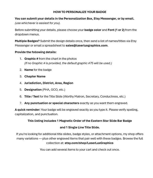 • Choose your badge color • Choose your graphic (if no graphic # is provided the default graphic #75 will be used) • Enter your personalization details • Add extra Title Slides to your cart if needed