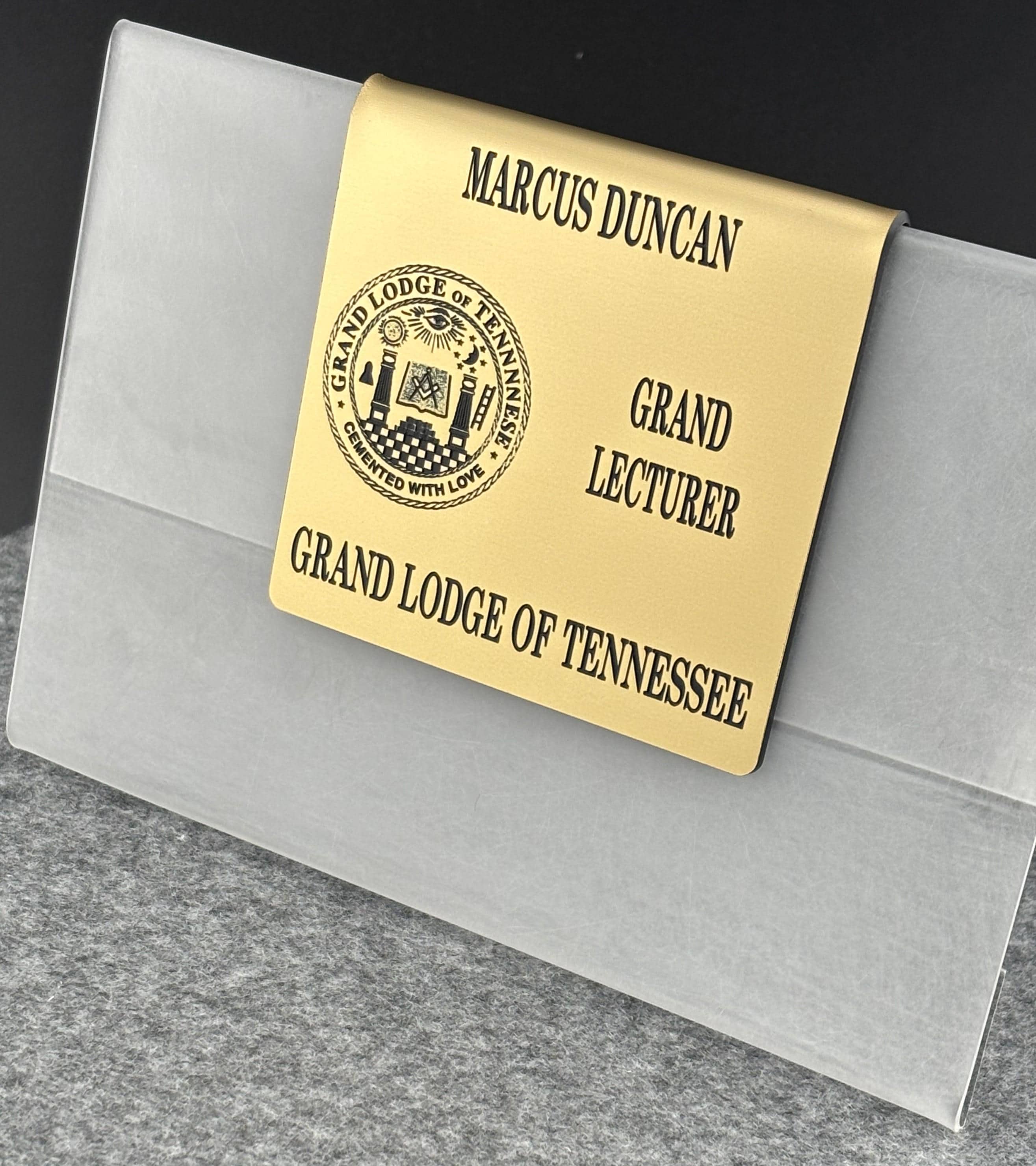 Present a polished, professional appearance at meetings, degrees, and official functions with this Grand Lodge of Tennessee Over‑the‑Pocket Name Badge. Each badge features the official Grand Lodge of Tennessee emblem and is custom engraved with your name and title for a clean, uniform look.